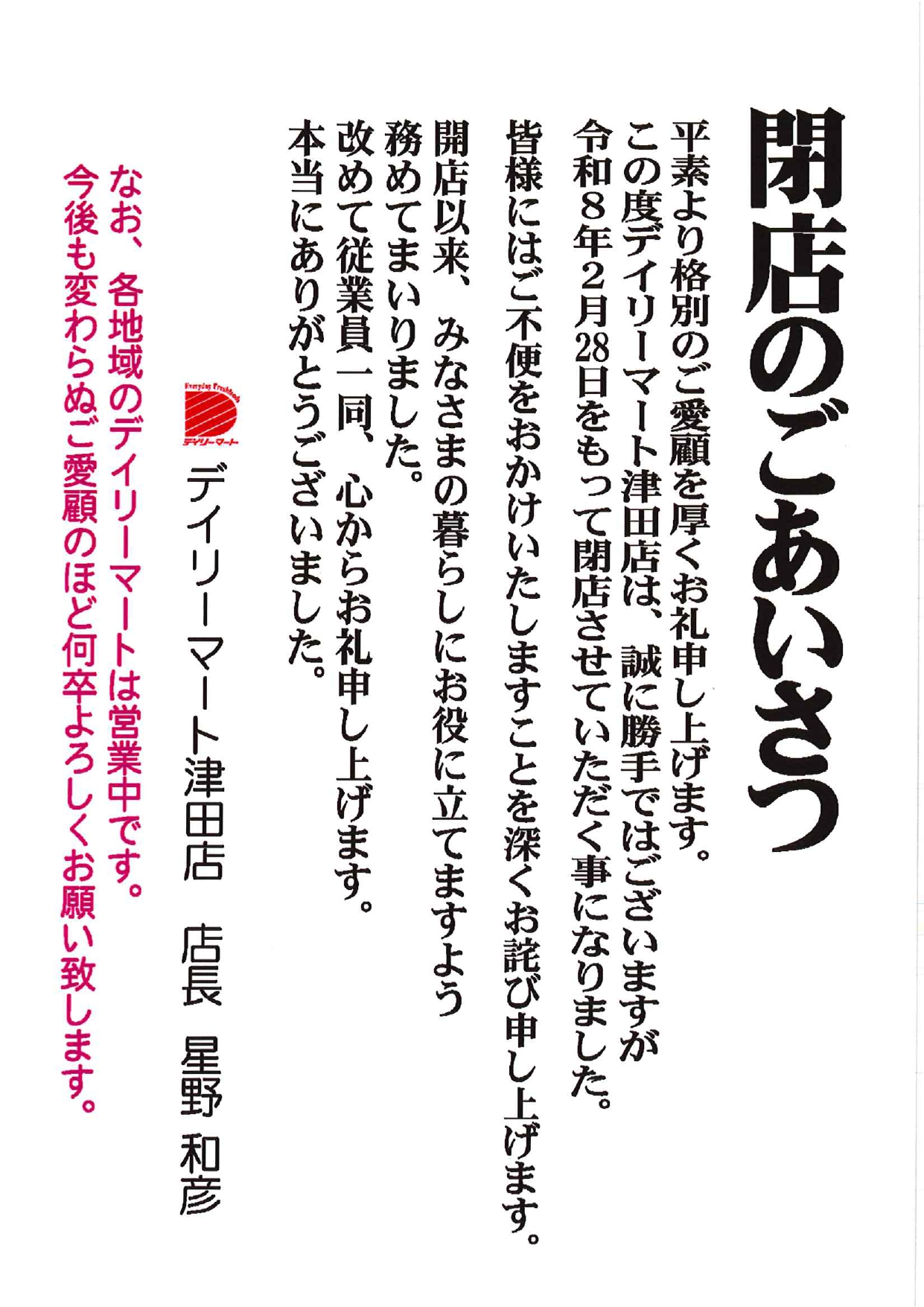 津田店 閉店のお知らせ | デイリーマート